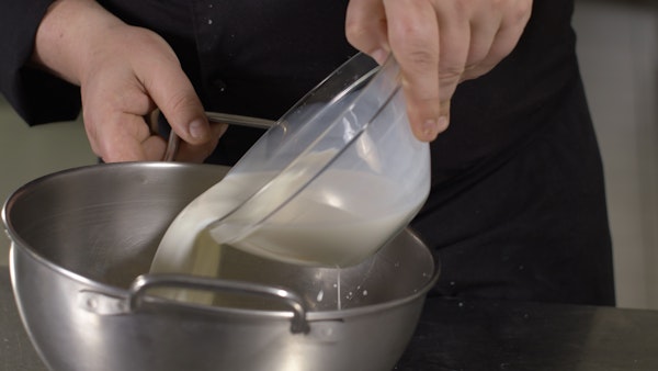 Aggiungi la farina setacciata e un pizzico di sale. Mescola accuratamente con una frusta per evitare che si formino grumi, poi copri con pellicola e lascia riposare in frigorifero per circa 30 minuti.
